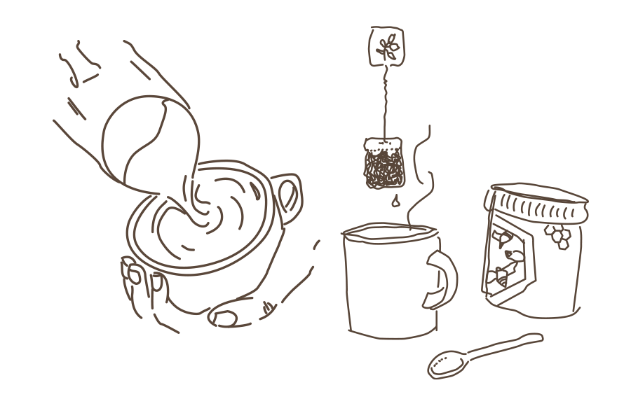 I caféen kan du nyde baristakaffe brygget på kaffebønner udvalgt og ristet lokalt på Aarhus Havn af Sydhavnskaffe. Du kan også vælge mellem et bredt udvalg af økologisk te, som de velkrydrede varianter fra Pukka og grøn te og urtete varianter fra Sonnentor.