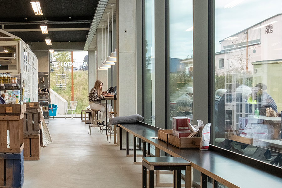 I caféen er der afslappet stemning og højt til loftet. Der er plads til dig, der gerne vil sidde med avisen eller dig, der har lyst til at sludre med venner eller mødes med naboerne. Der er også plads til, at du kan pusle babyen eller arbejde eller holde små møder.